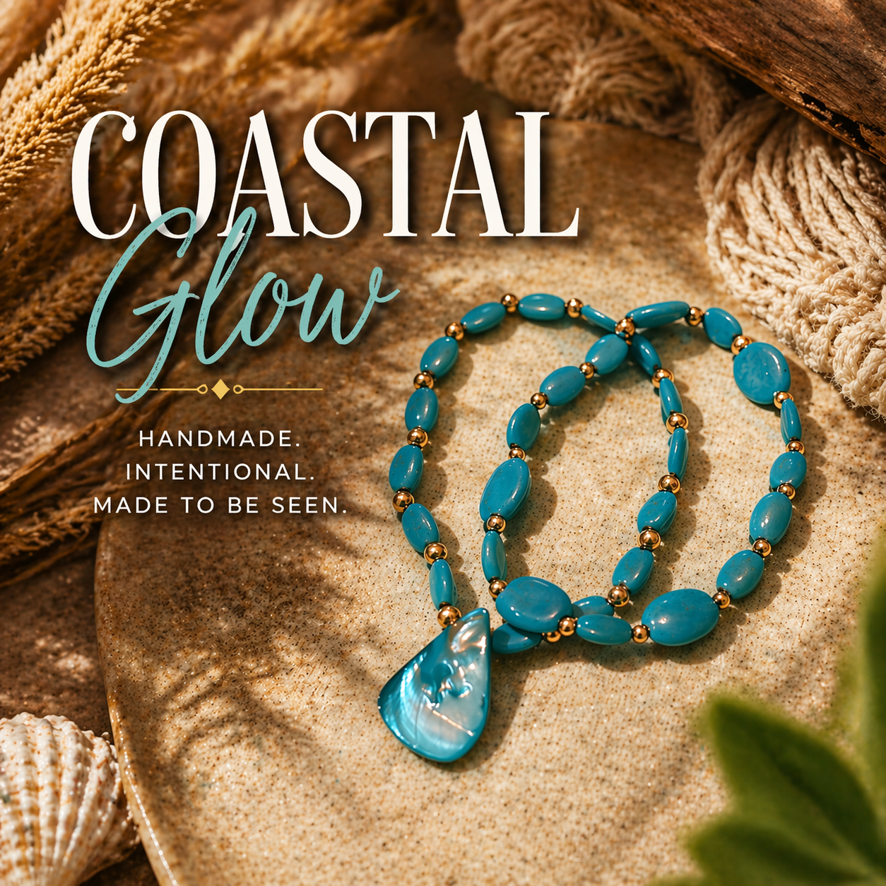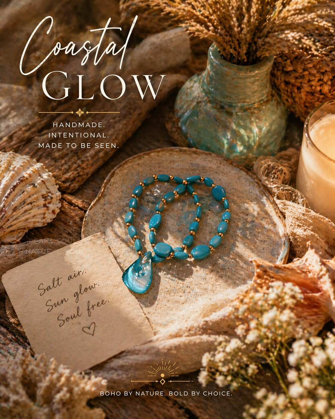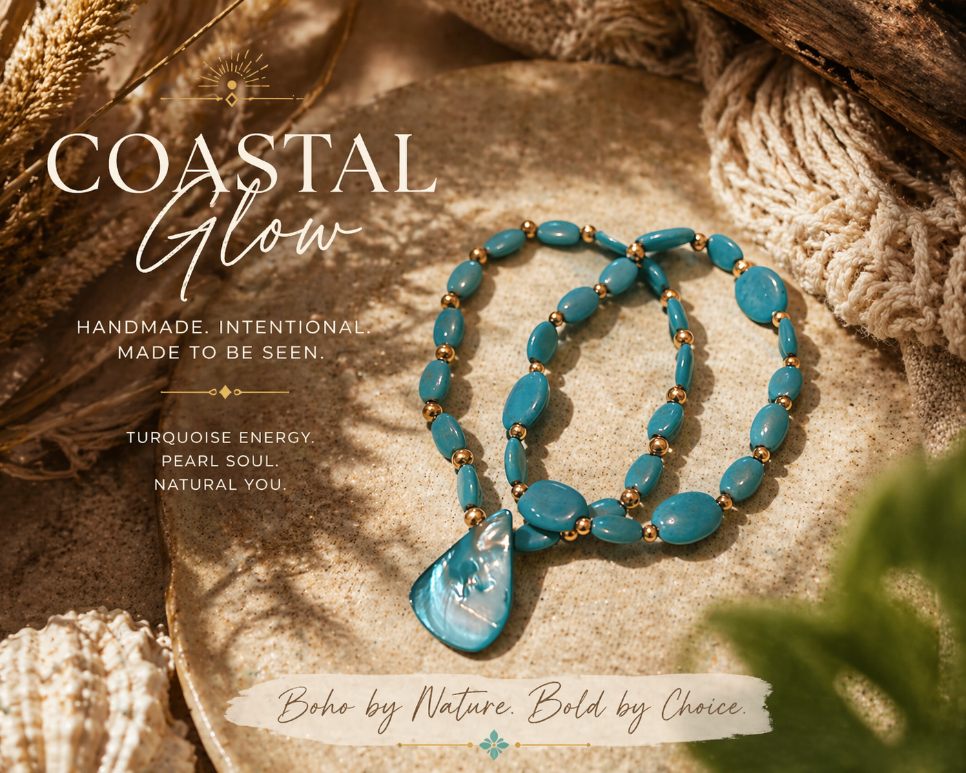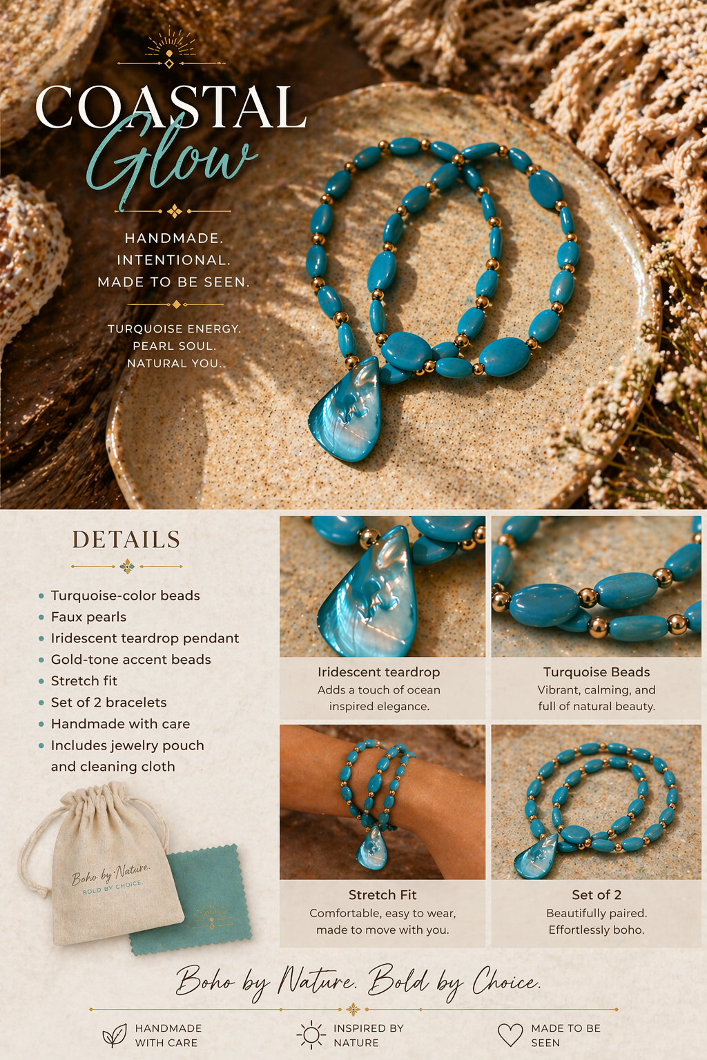 Handmade stretch bracelet set featuring turquoise-color beads, a pearl shell teardrop pendant, and iridescent spacer accents. Designed to bring a soft coastal feel with a bold statement touch, this set blends natural inspiration with everyday wear.