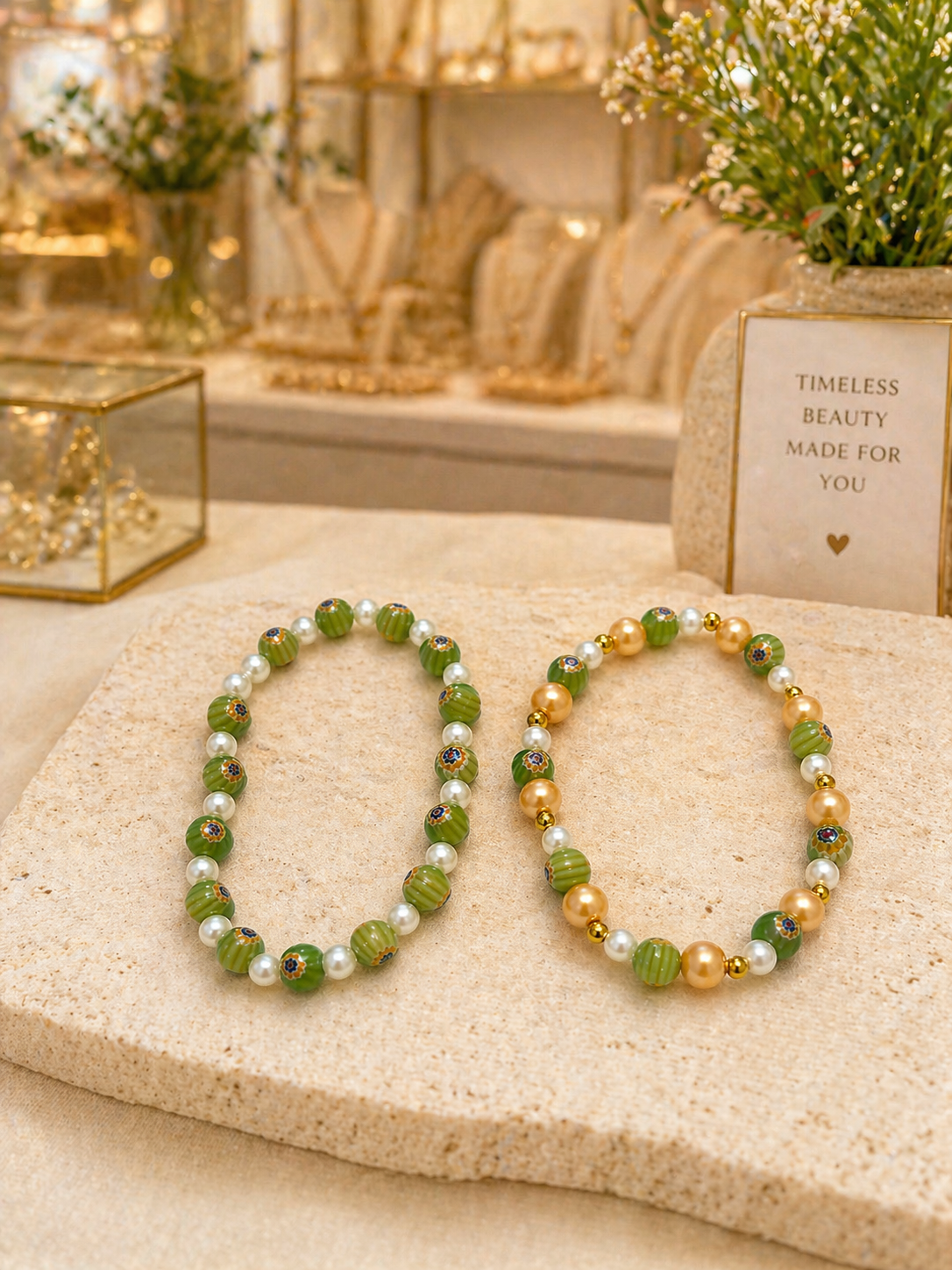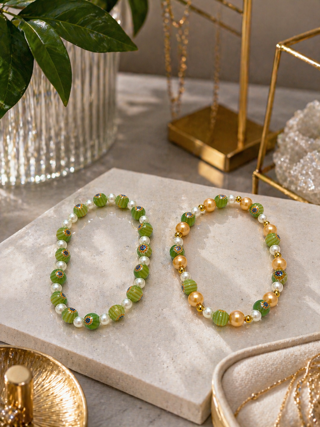 Each bracelet features a thoughtful combination of millefiori glass beads, soft imitation pearls, and gold-tone accents, creating a harmonious blend of earthy color and radiant detail.