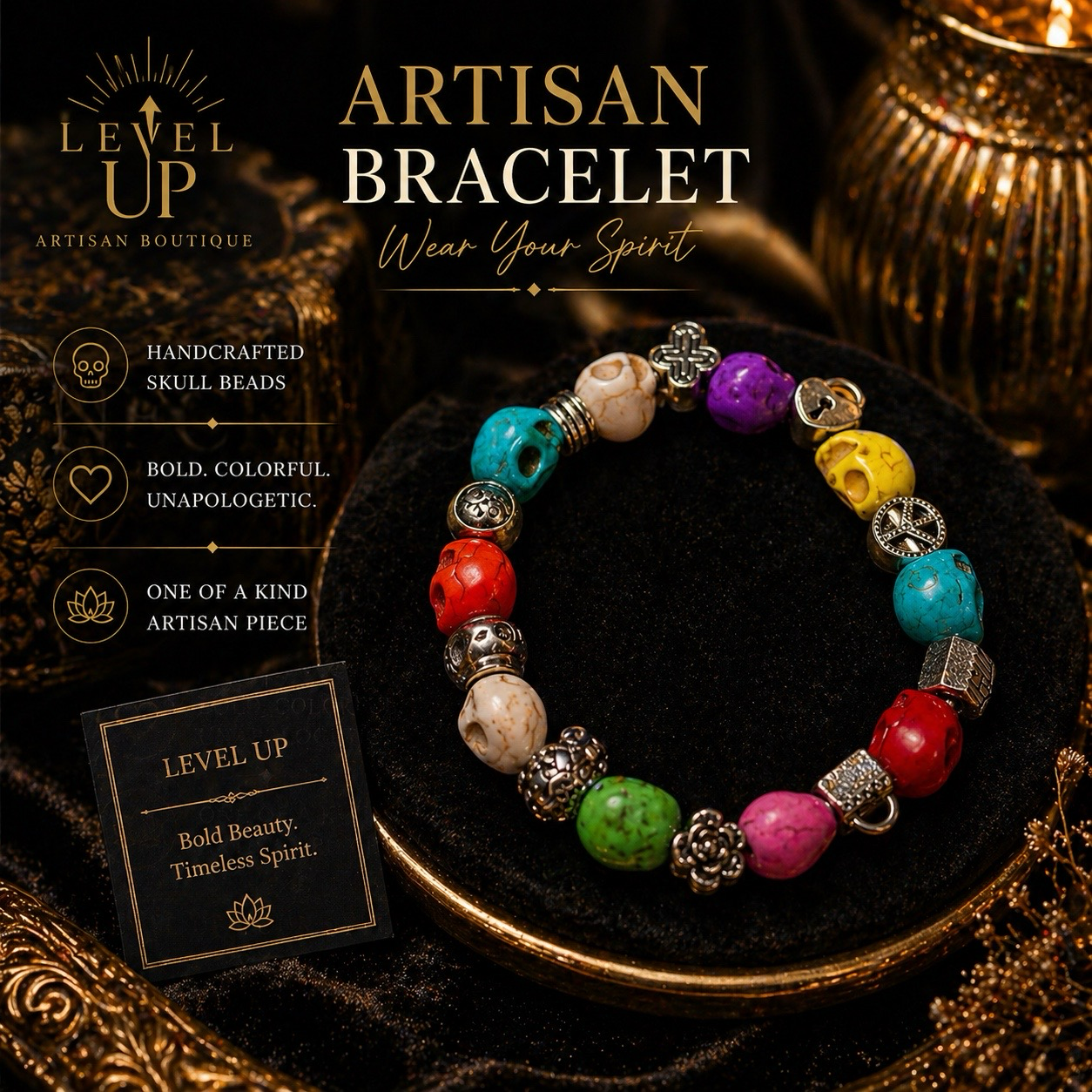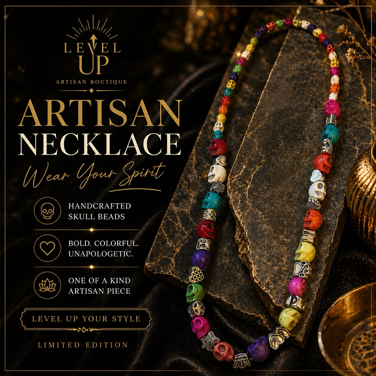 Each bead is intentionally placed, blending vibrant skull accents with detailed metal elements to create a look that is both edgy and soulful. This piece isn’t just jewelry—it’s a statement of confidence, creativity, and personal power.