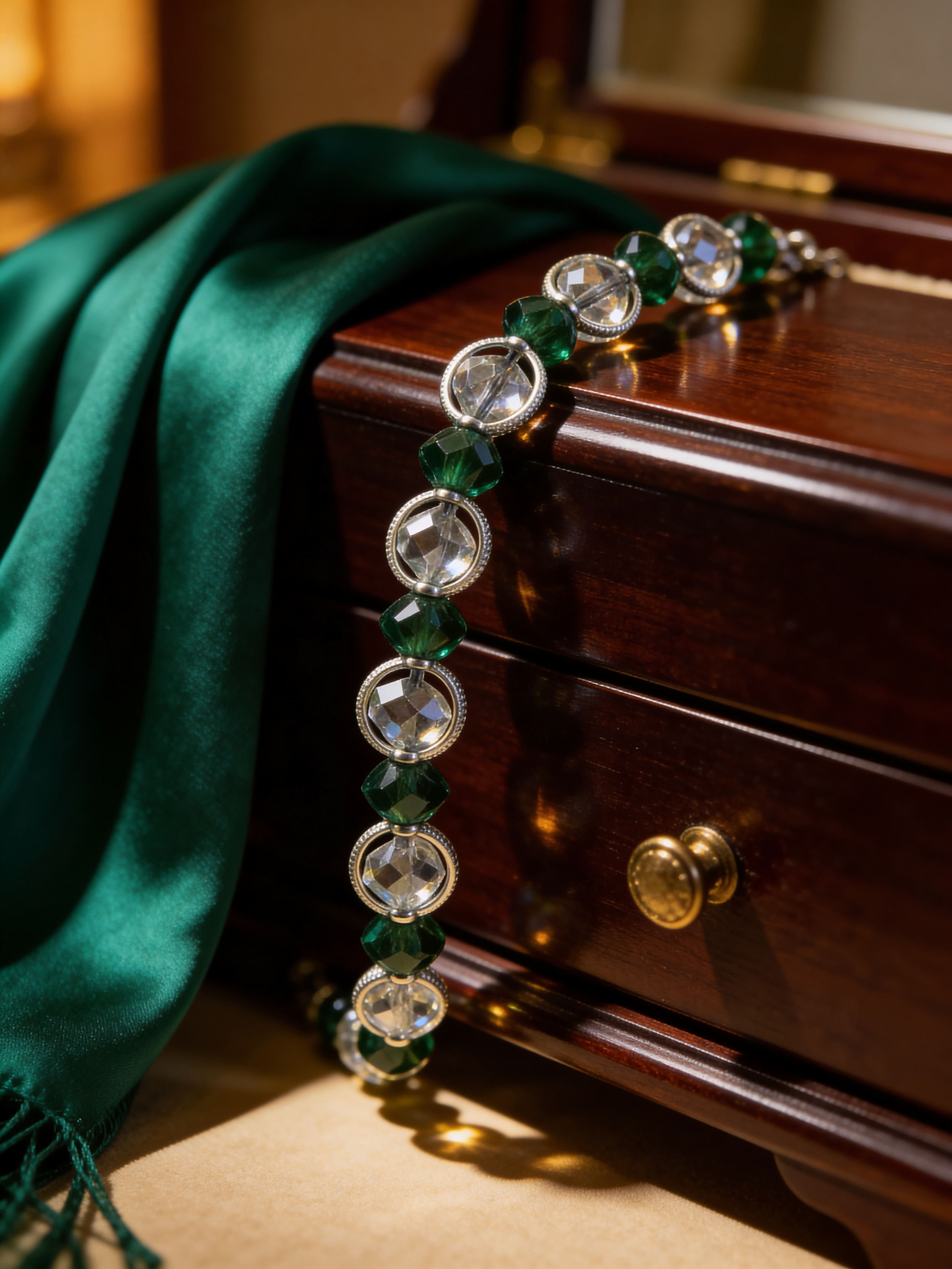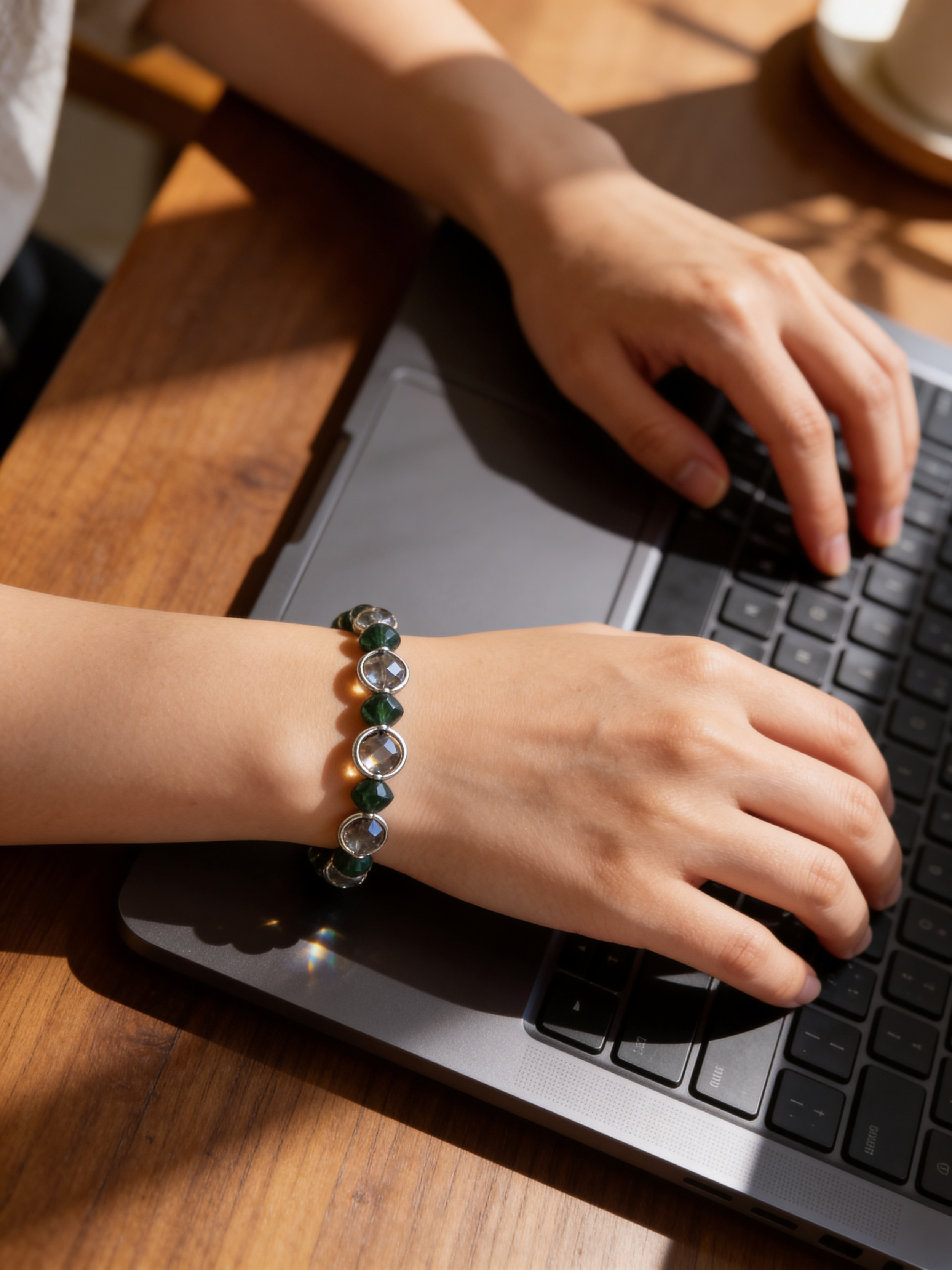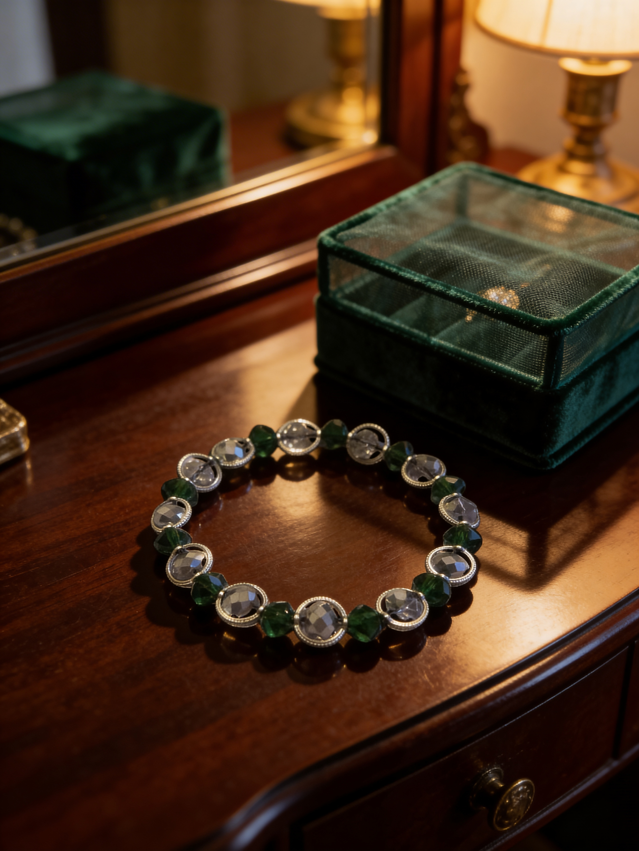 Elegant and radiant, the Emerald Glow Stretch Bracelet features rich green beads paired with warm gold accents for a timeless boutique look. Designed to stretch comfortably for everyday wear, this handcrafted piece adds a soft glow of color and sophistication to any outfit. Perfect for stacking or wearing alone as a subtle statement.