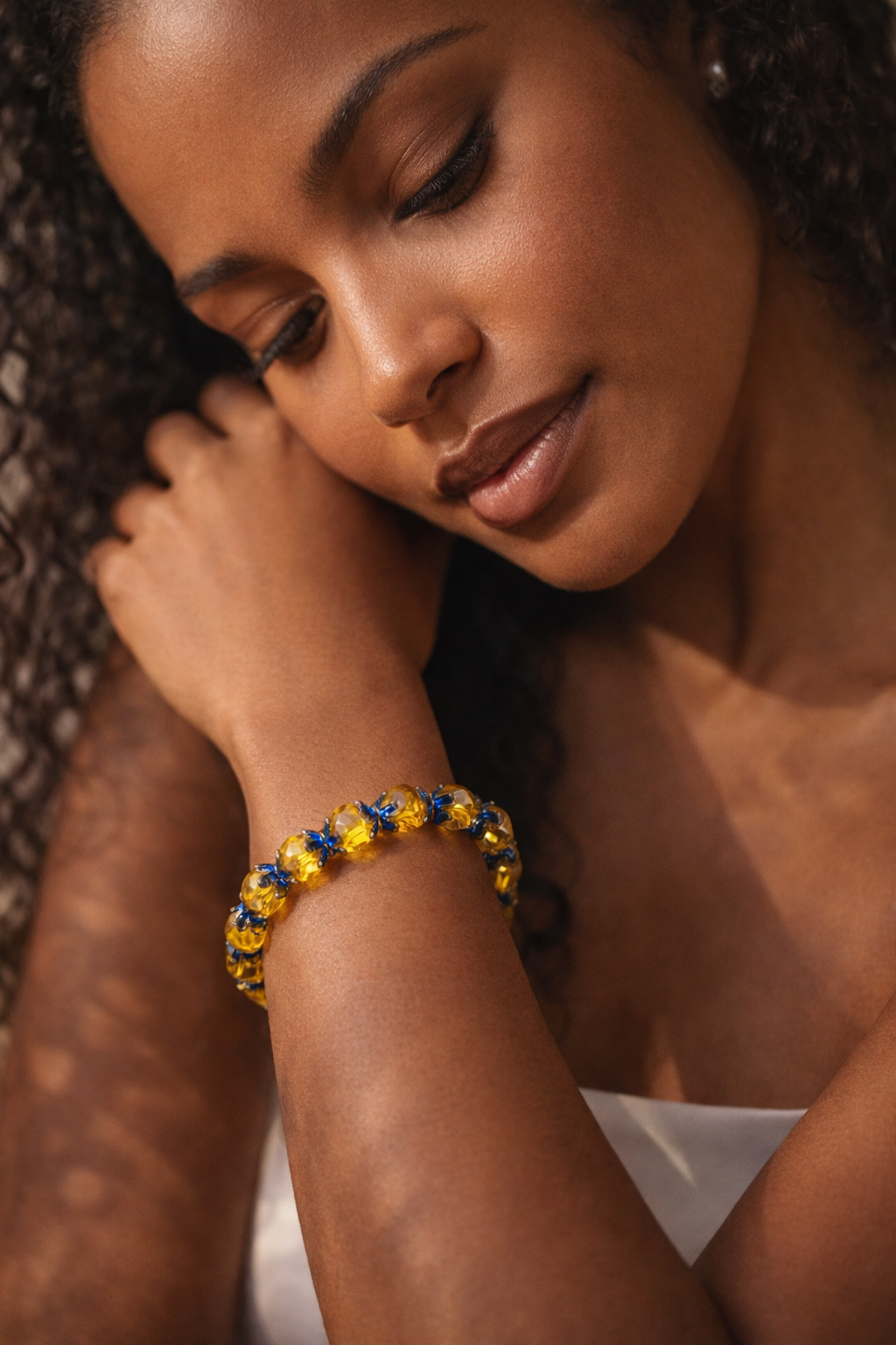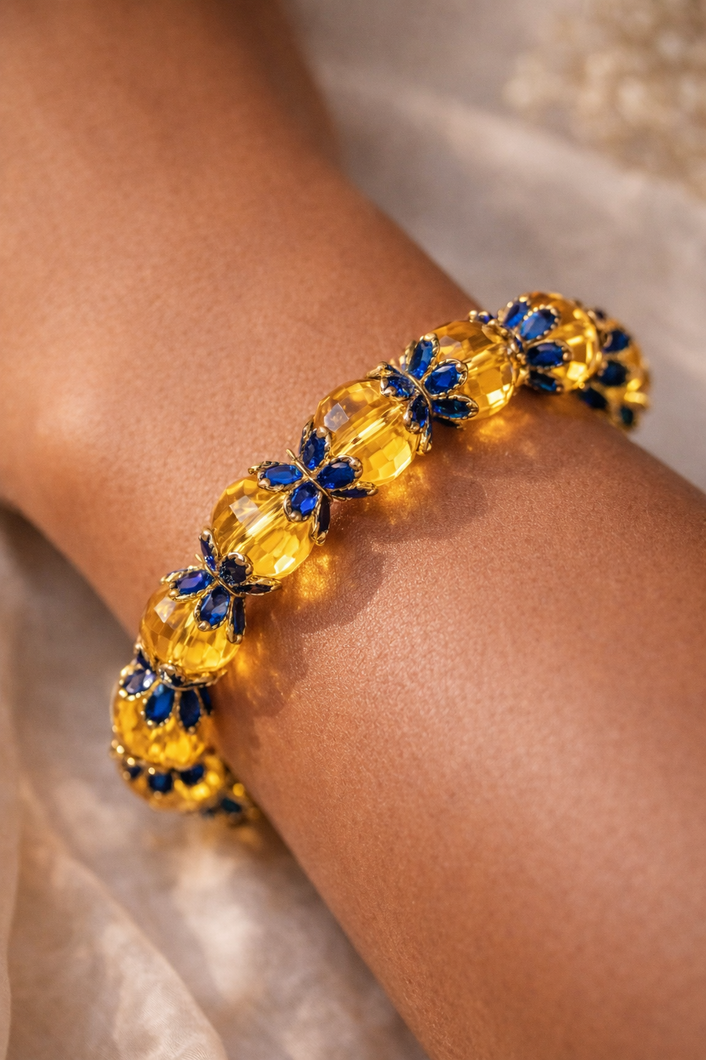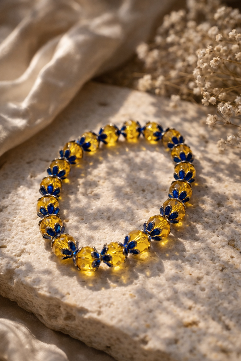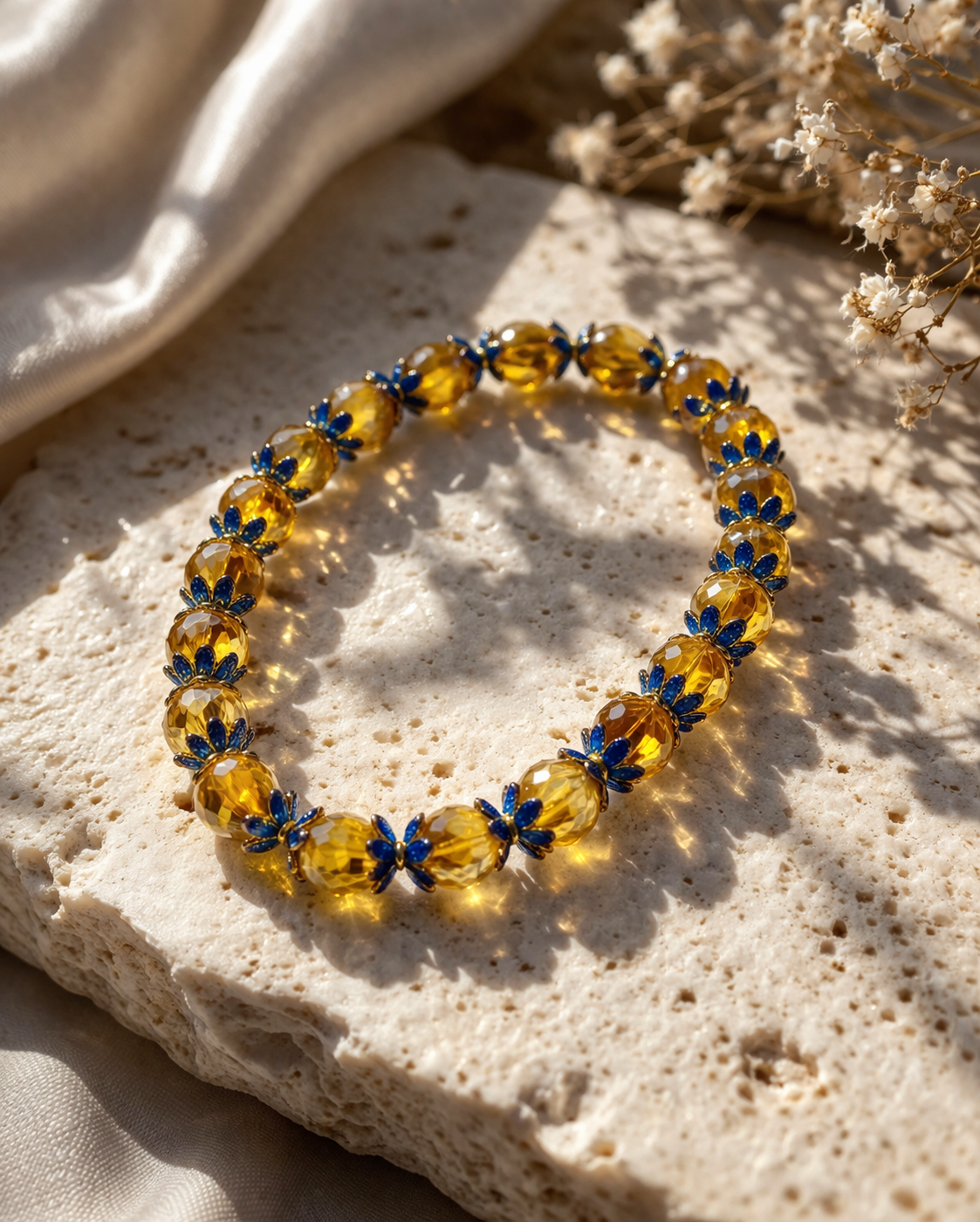 Softly glowing with warmth and intention, the Golden Bloom Radiance Bracelet is a delicate balance of light and detail. Featuring faceted golden beads that catch the light with every movement, each piece is accented with deep blue floral spacers that bring contrast, depth, and a subtle statement of elegance.