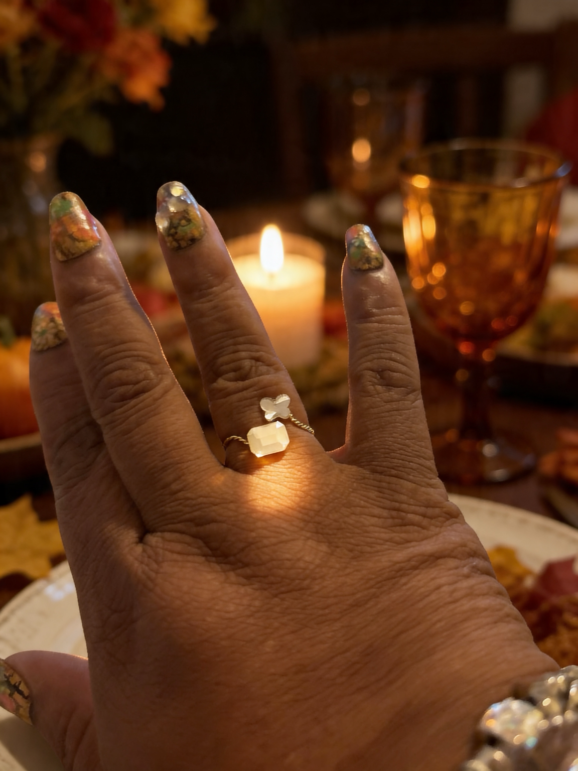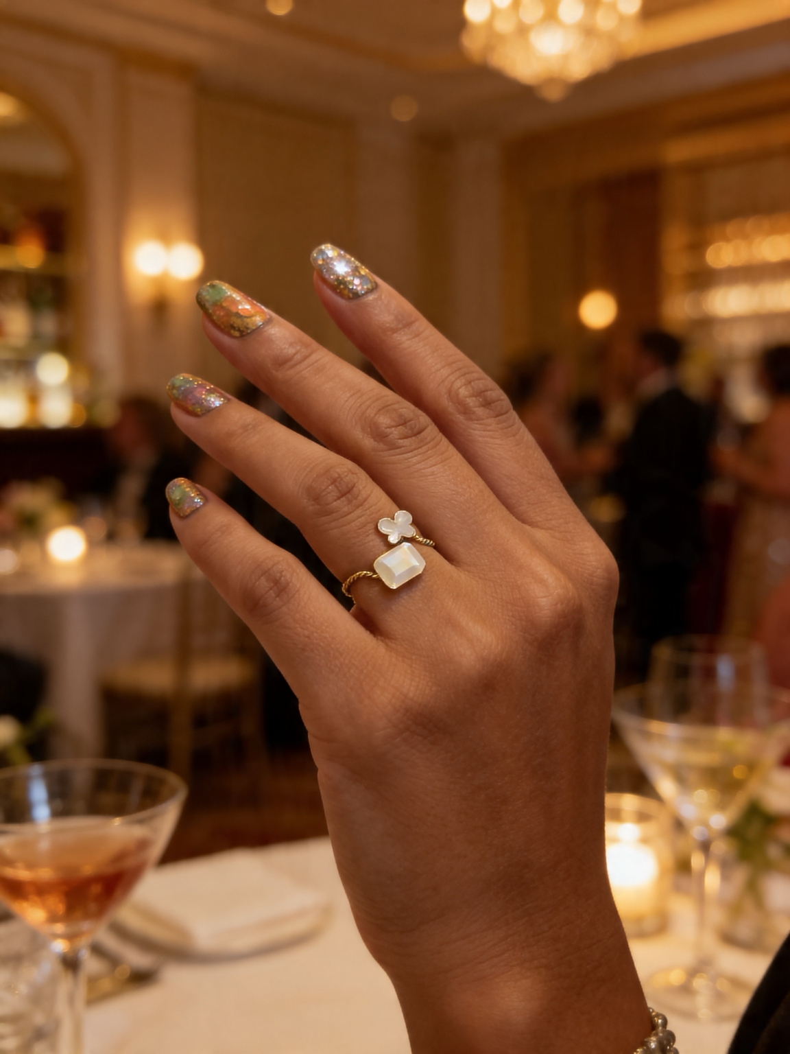 This handcrafted adjustable wrap ring features delicate crystal accents designed to catch the light with every movement.