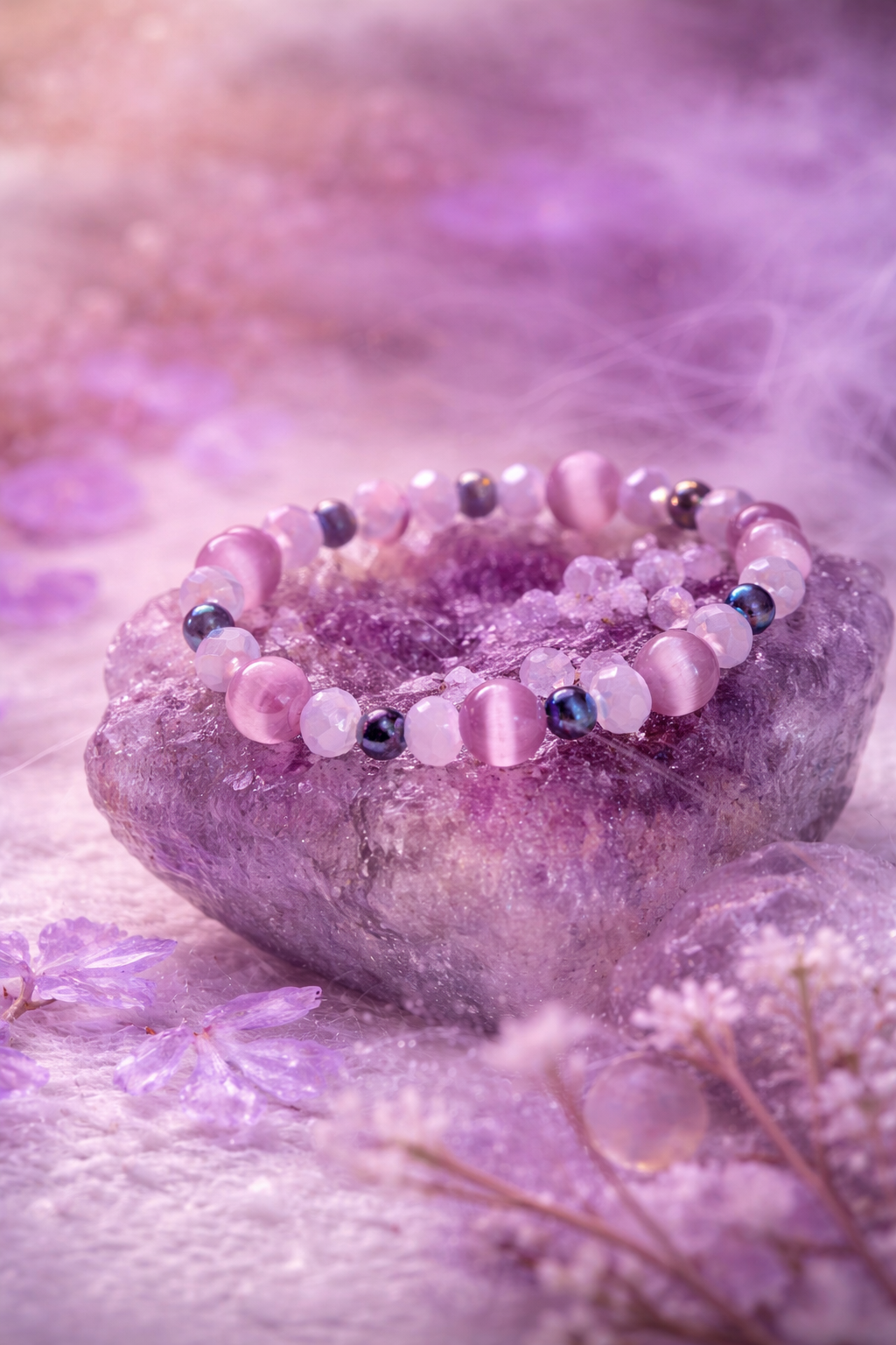 Featuring luminous blush-toned beads paired with subtle iridescent accents, this handcrafted piece reflects a gentle, feminine energy inspired by moonlight and blooming petals. Its soothing color palette and refined design make it perfect for everyday wear or moments when you want to feel centered and at peace.