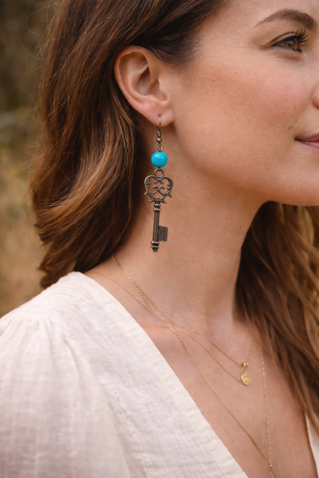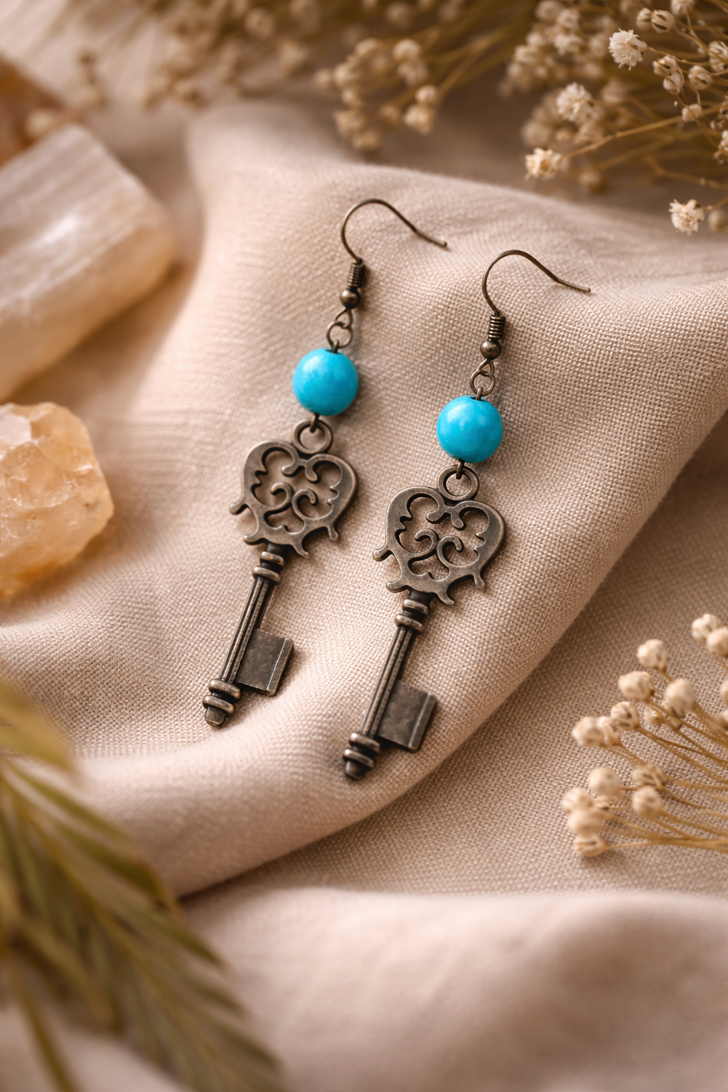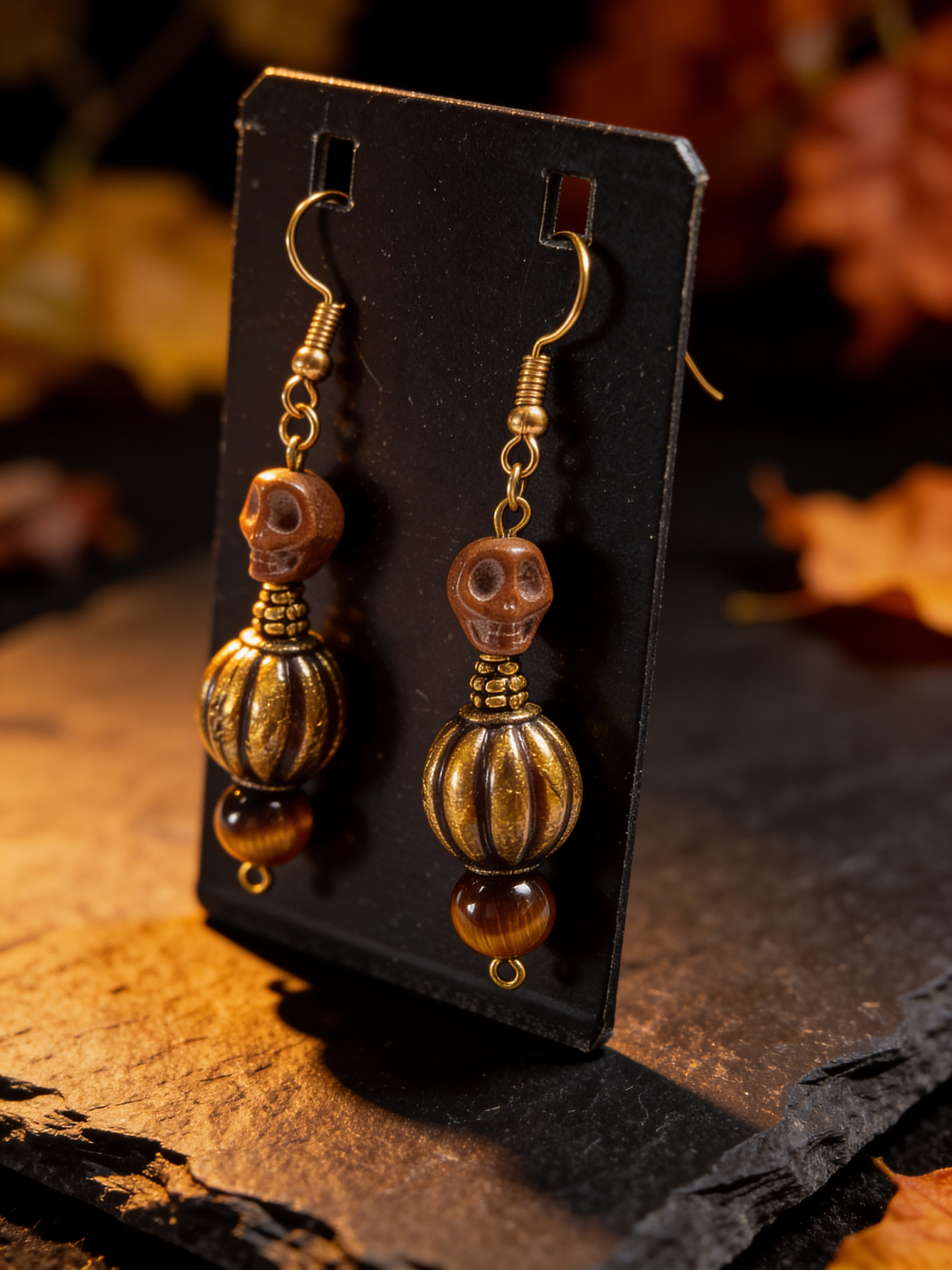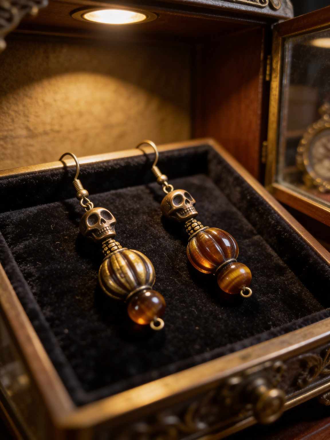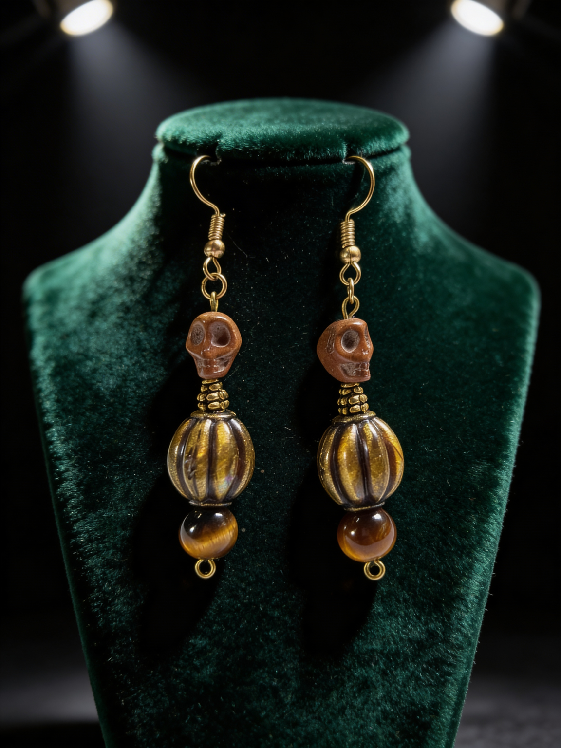 These handcrafted earrings feature rich amber-toned beads, antique gold accents, and detailed skull elements that bring a touch of edge while maintaining a grounded, earthy elegance. The combination of textures and tones creates a unique balance between strength and style.