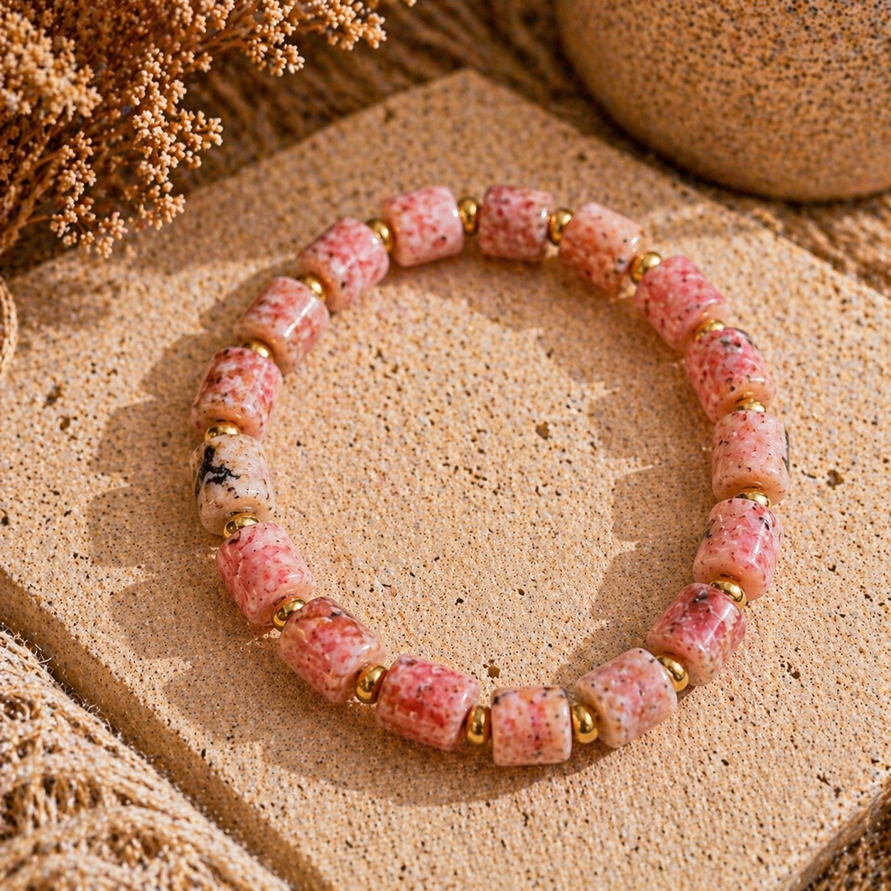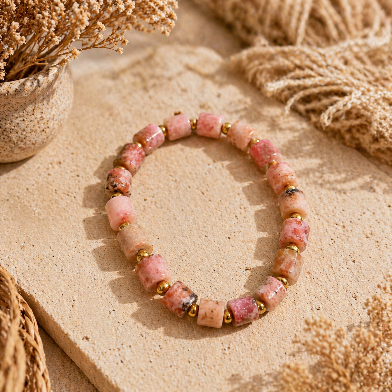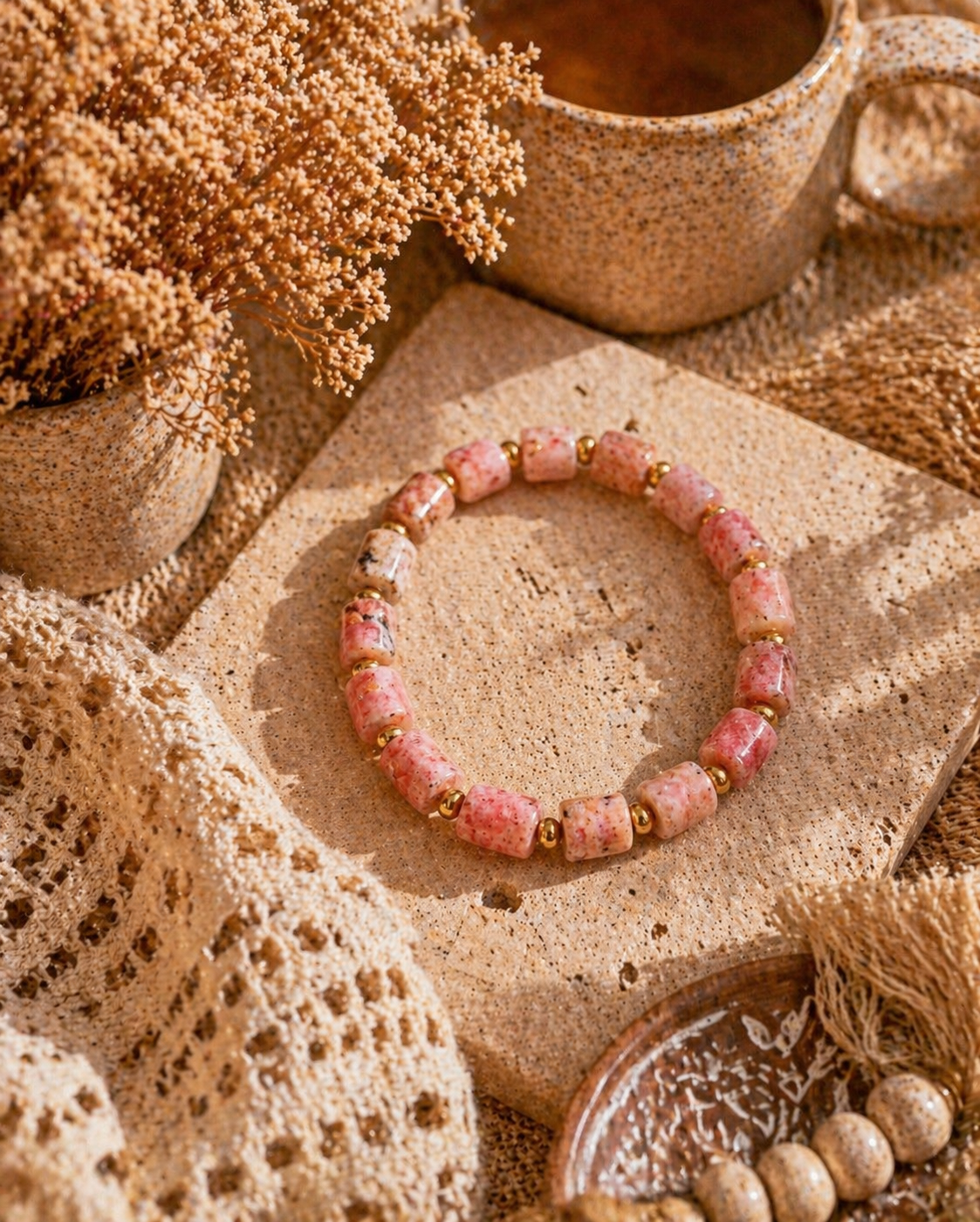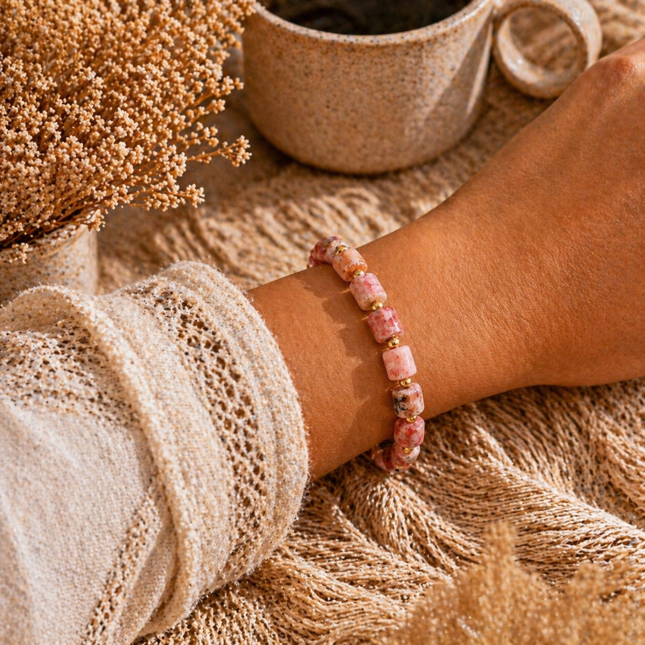A grounded blend of soft pink stone and warm gold accents, this bracelet brings together natural texture and quiet elegance.