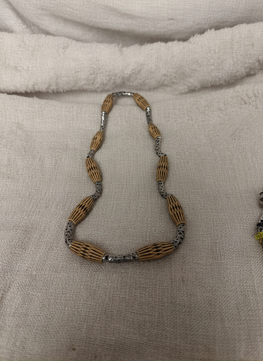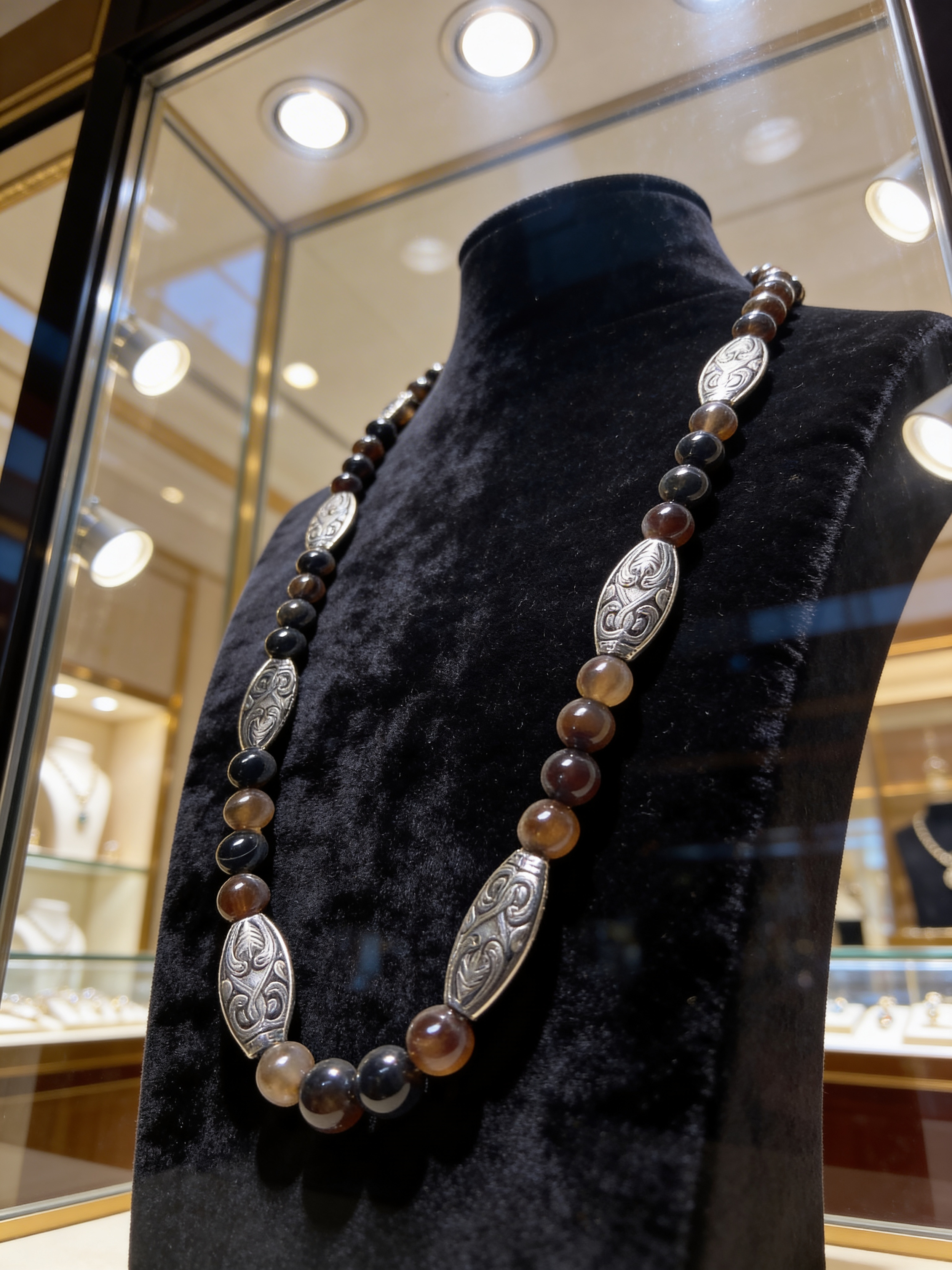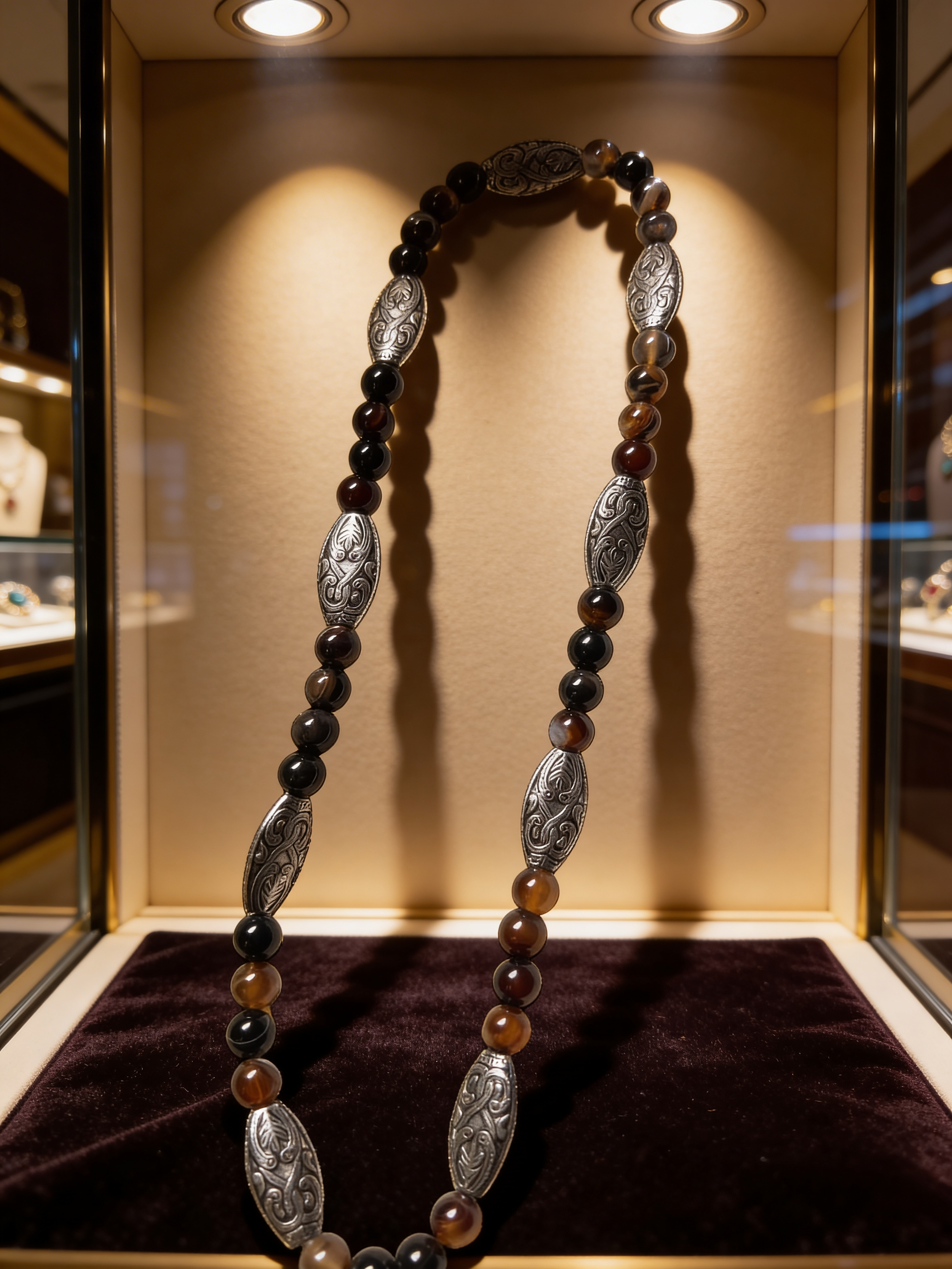 The soft matte finish of the wooden beads brings a natural, earthy touch while the ornate silver spacers add contrast and sophistication. Together they form a necklace that feels both calming and stylish.