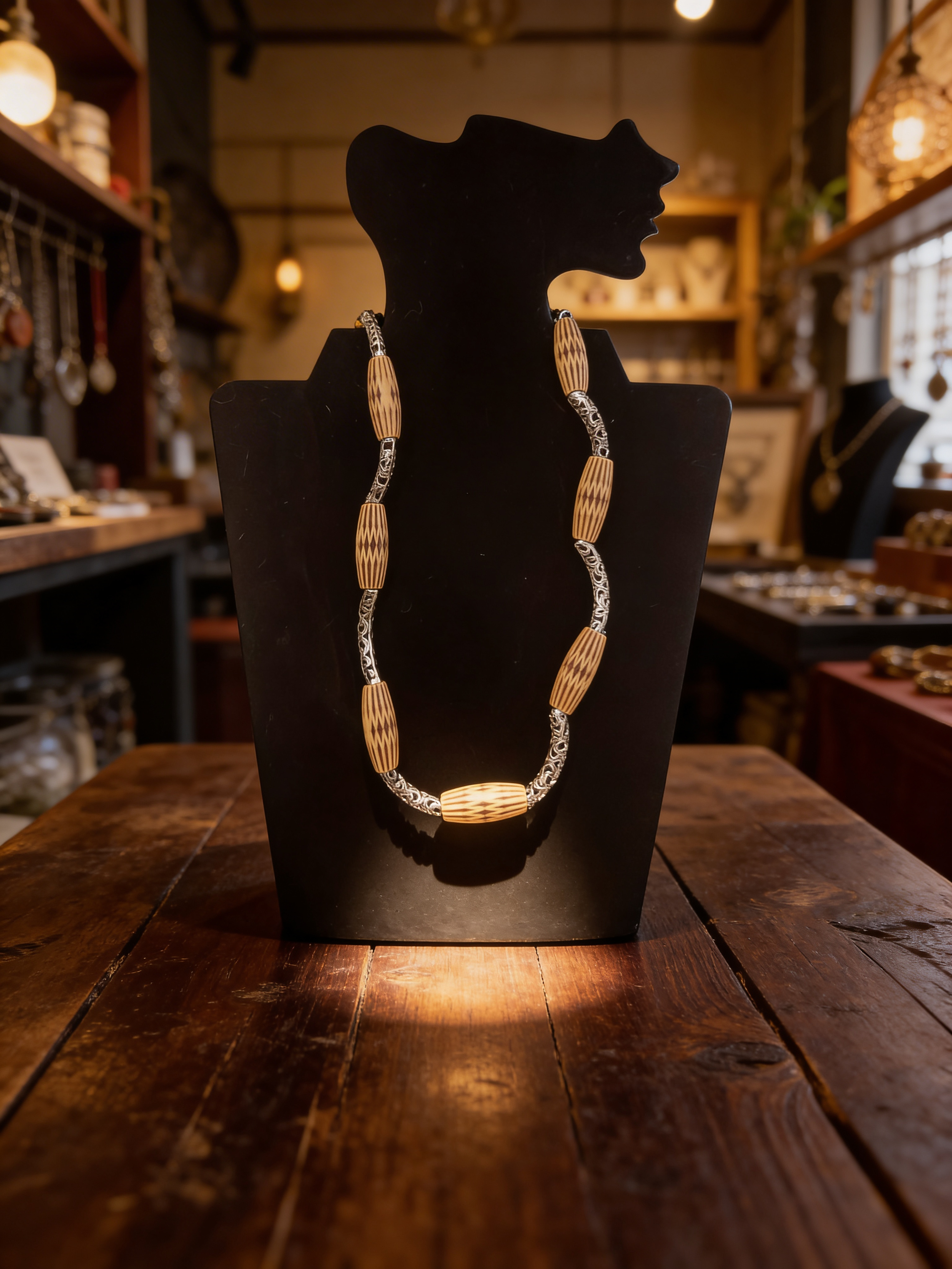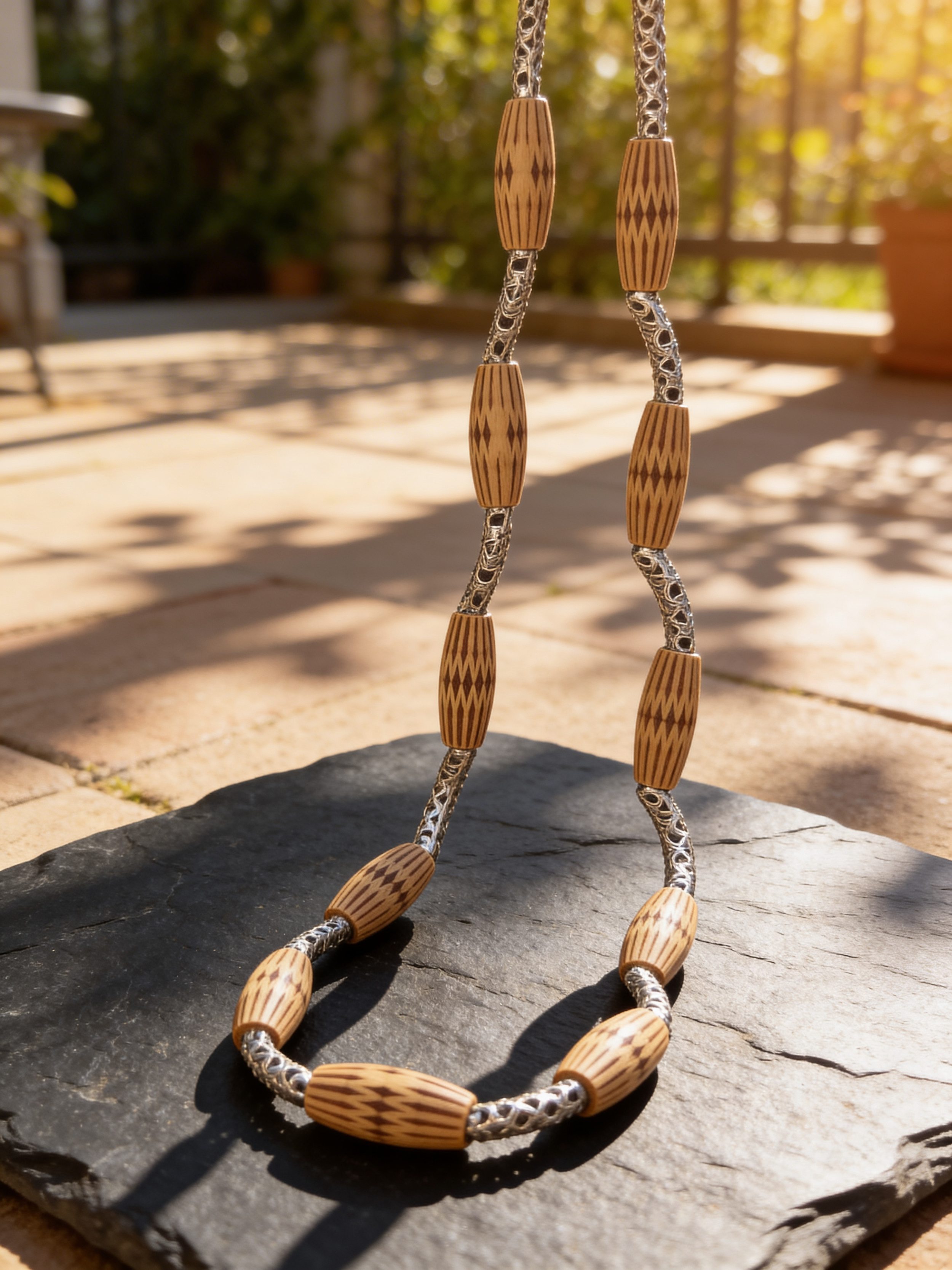The Serenity Wood & Silver Harmony Necklace blends natural beauty with elegant detail. This handcrafted design features smooth white wood-style beads paired with textured silver-toned accents that create a flowing and balanced pattern.