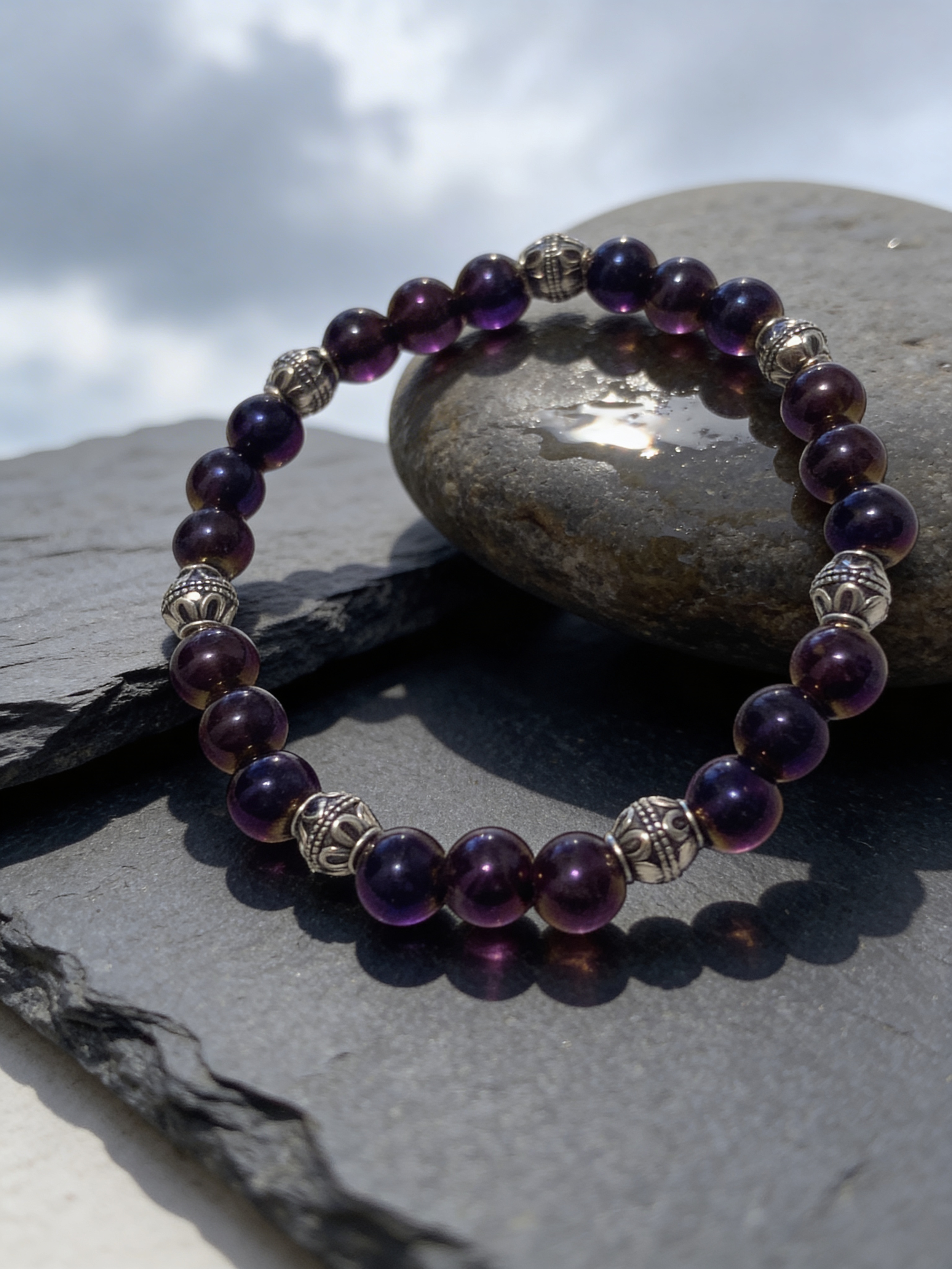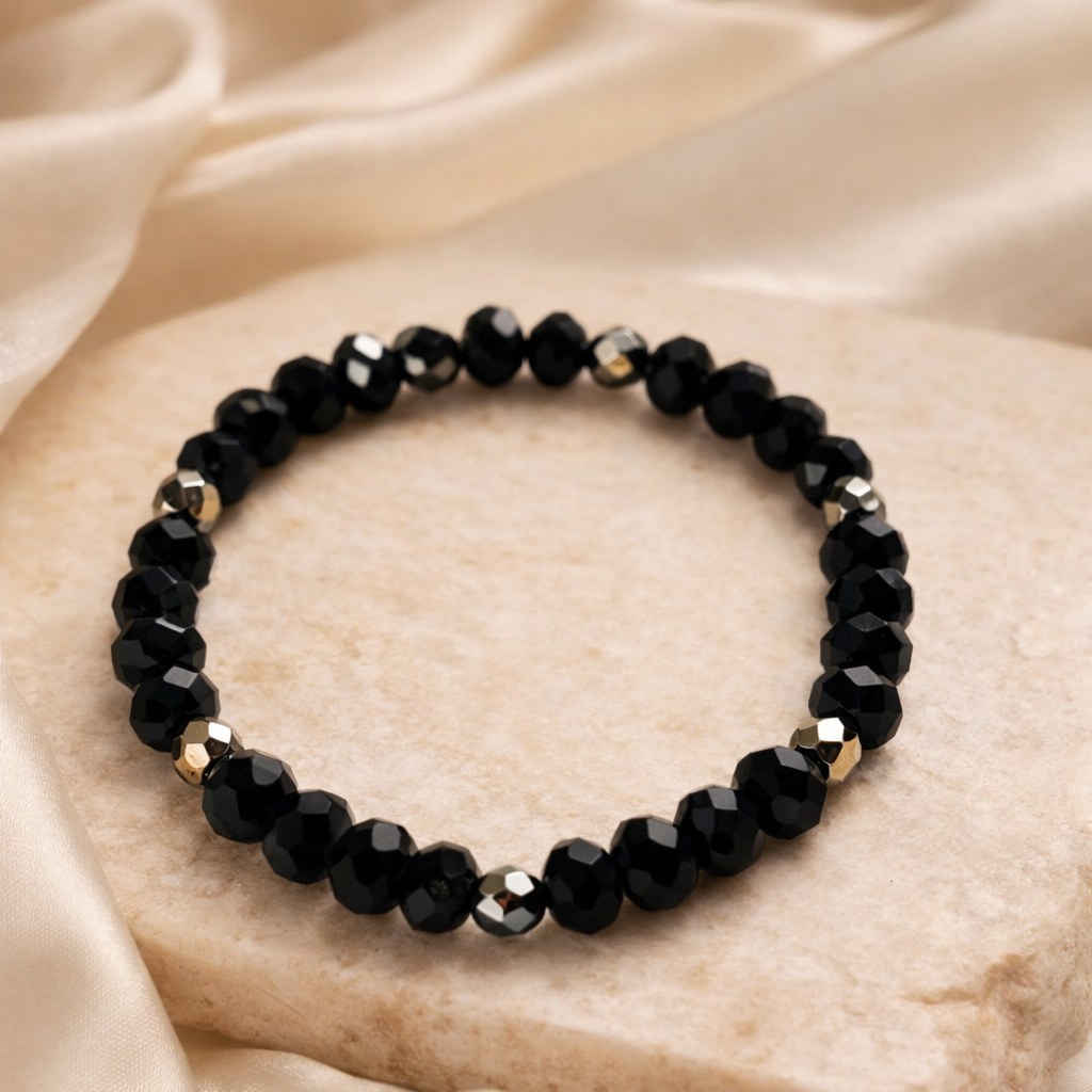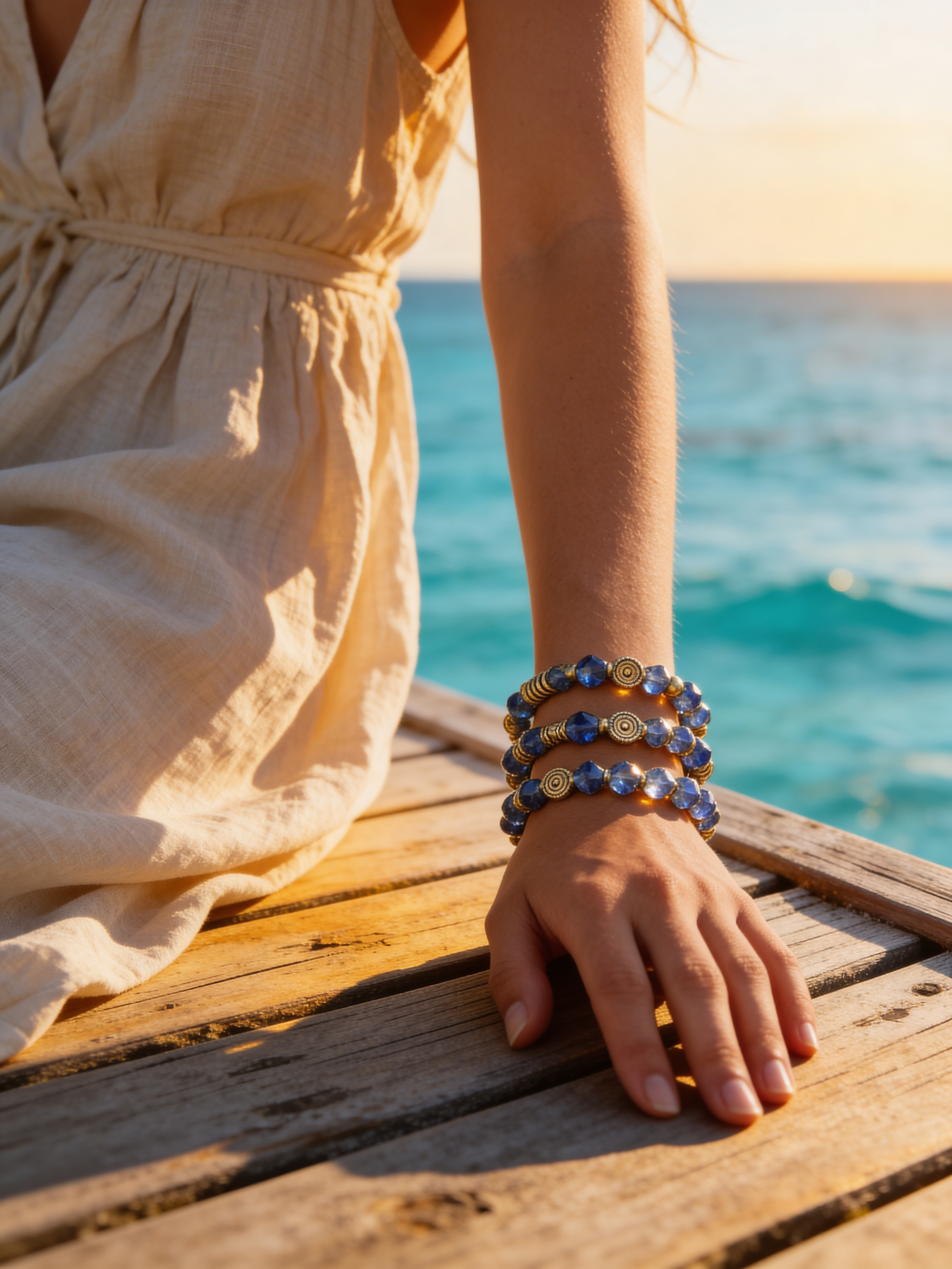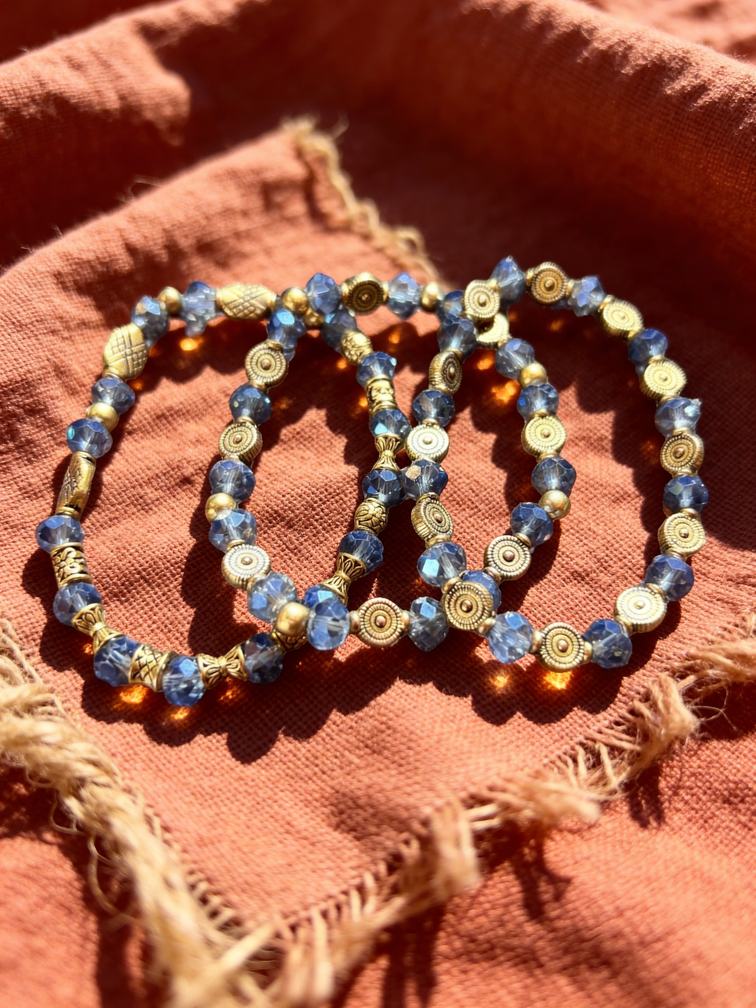 Featuring radiant blue faceted beads paired with warm gold-tone accents, each bracelet carries its own unique pattern while blending effortlessly together as a stack. Wear them all at once for a layered statement, or mix and match for a more subtle touch.
