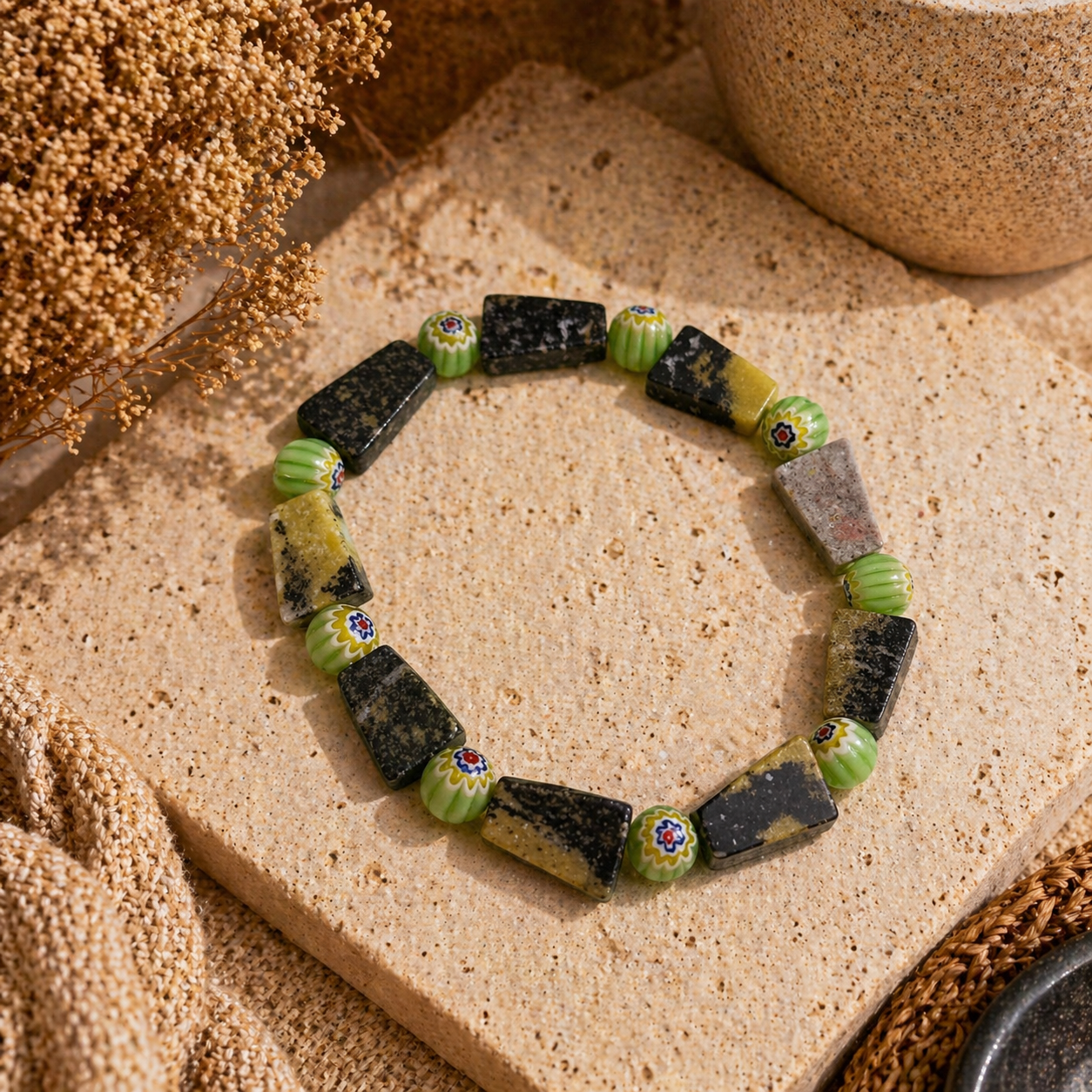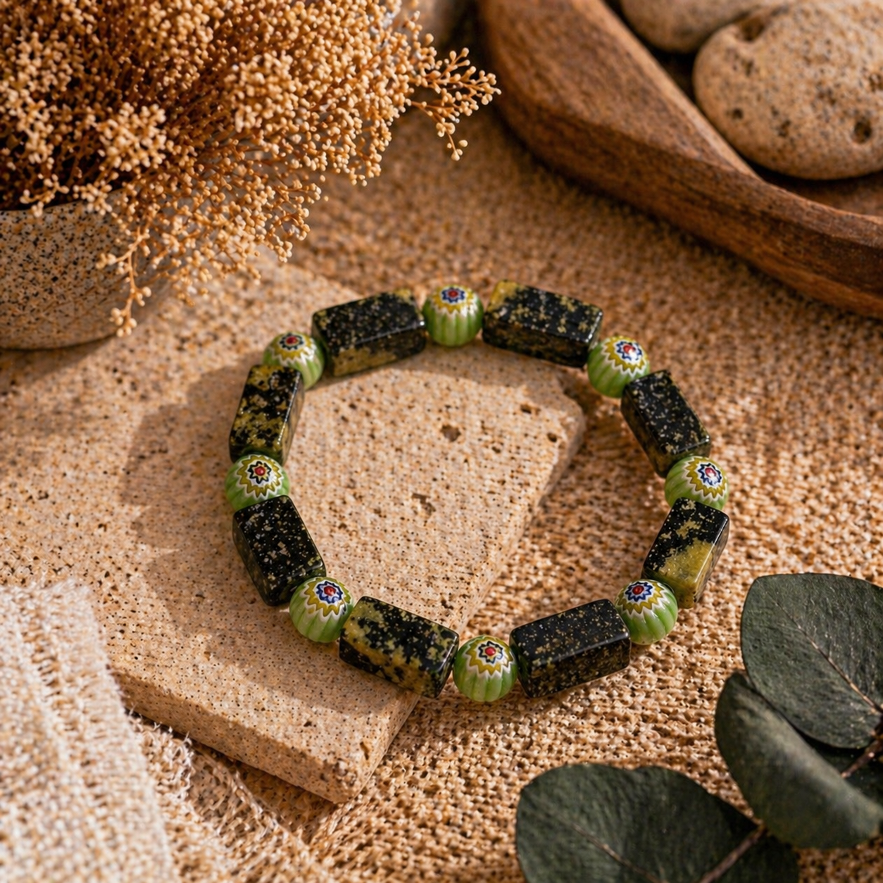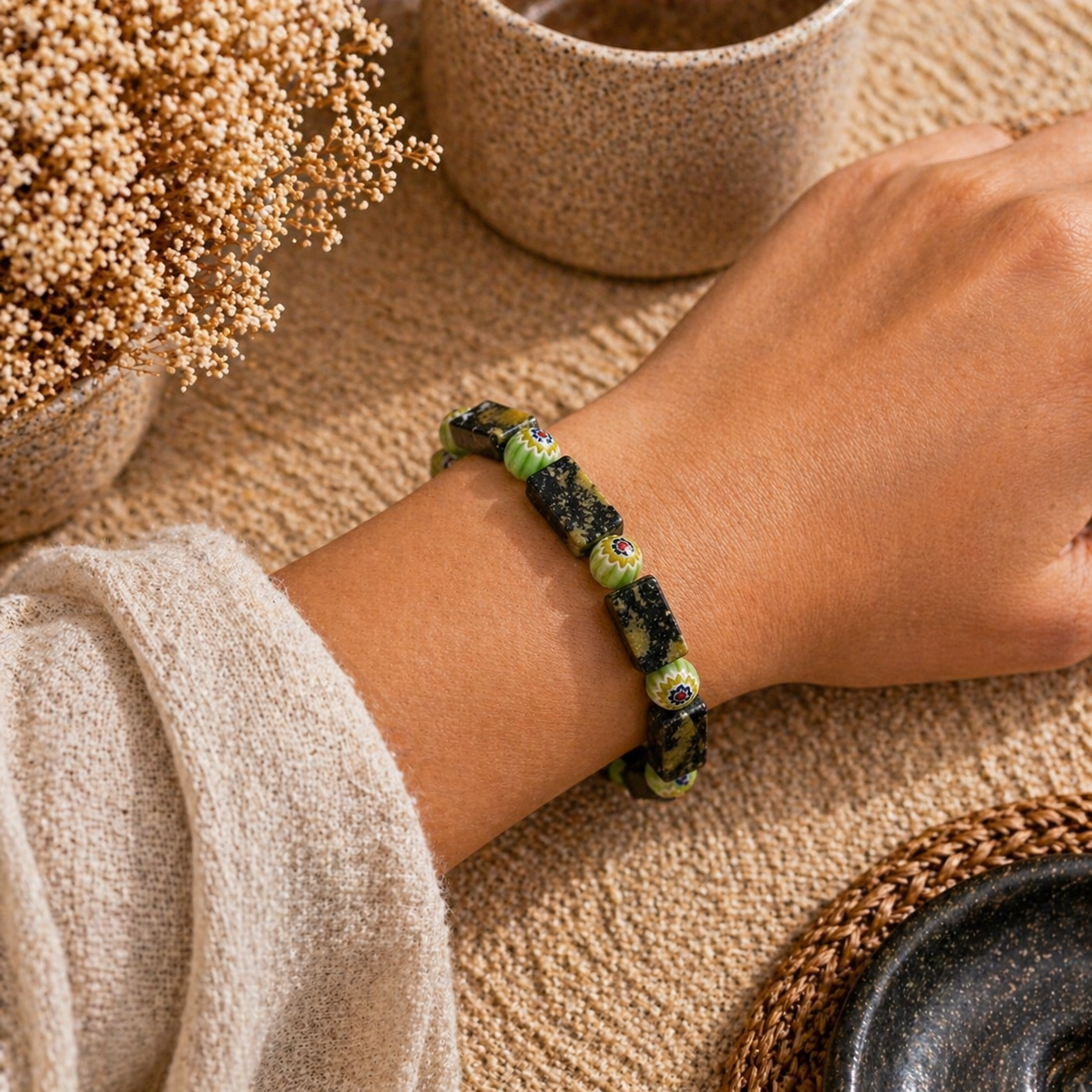 A grounded yet refreshing design, this bracelet blends earthy stone textures with soft green floral accents for a look that feels both natural and alive.