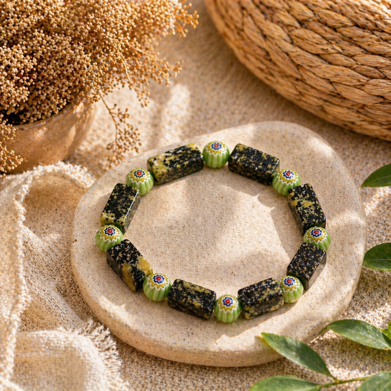 The contrast of deep, speckled stone beads with vibrant green patterned details creates a unique rhythm—bringing balance, character, and a subtle pop of color to your everyday style. Each element is thoughtfully placed, giving the piece a handcrafted, one-of-a-kind feel.
