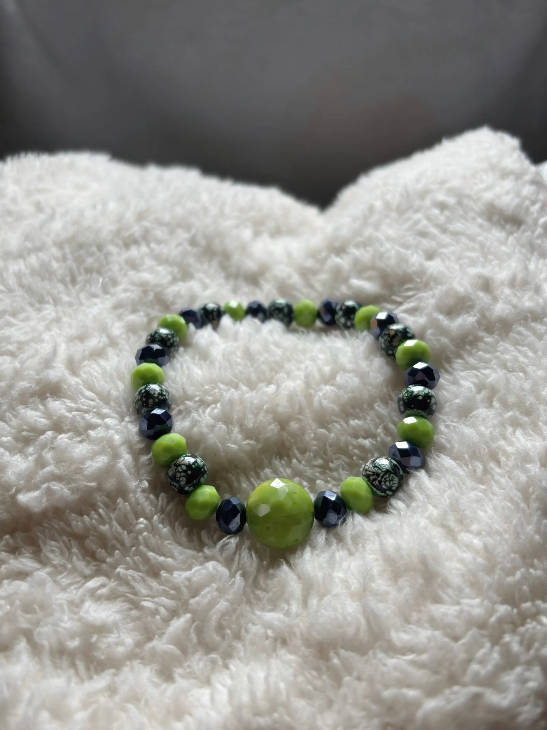 Designed with faceted crystal-style beads, decorative patterned accents, and a bold emerald center bead for a radiant finish.